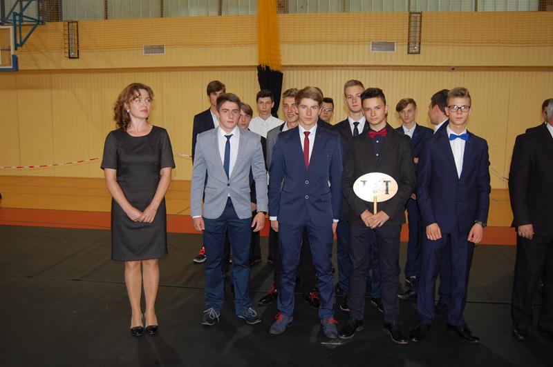 Pani dyrektor Joanna Dymitrowska przywitała nowych uczniów i ich rodziców ,dziękując za wybór szkoły . Przedstawiła również krótką historię szkoły od jej powstania w 1950 do dnia dzisiejszego ukazując przemiany kierunków zgodnie z potrzebami rynku edukacyjnego ,a przede wszystkim rynku pracy.