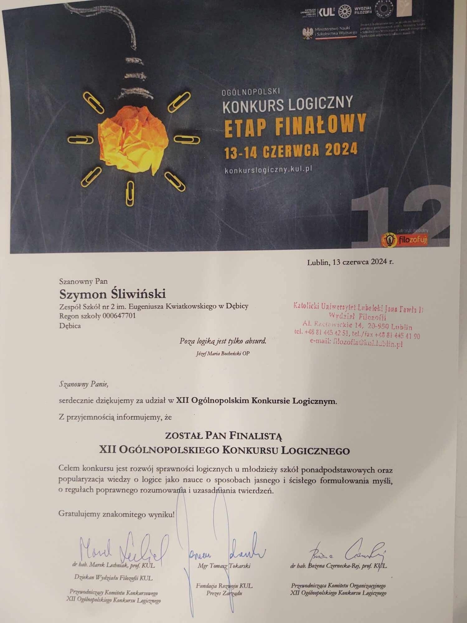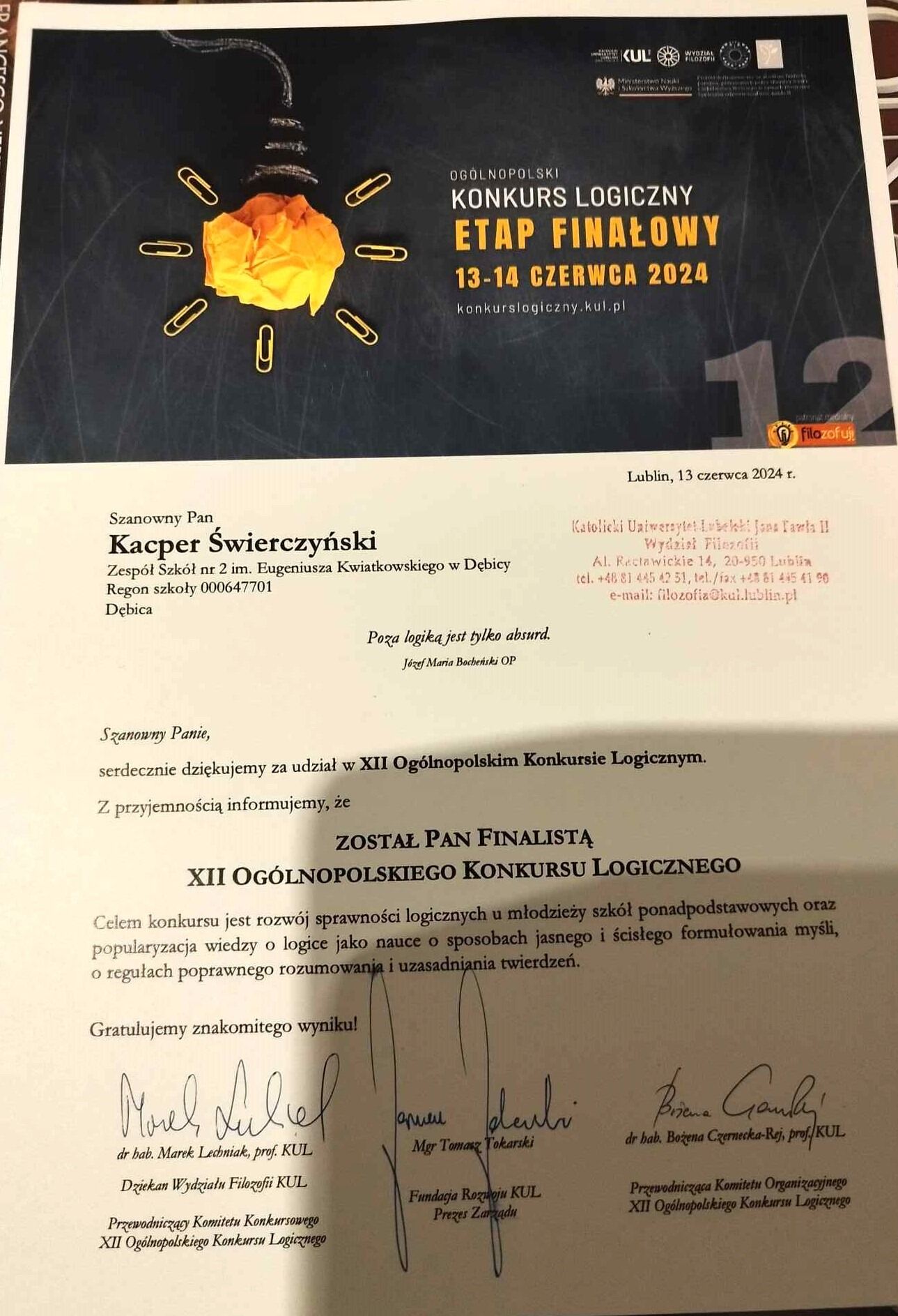 Jest nam niezmiernie miło poinformować że uczeń Kacper Świerczyński z klasy 1 CET i Szymon Śliwiński z klasy 1 DT zostali Finalistami Ogólnopolskiego Konkursu Logicznego, który odbył się w dniach 13 -14 czerwca 2024 w Katolickim Uniwersytecie Lubelskim Jana Pawła II. Gratulacje!