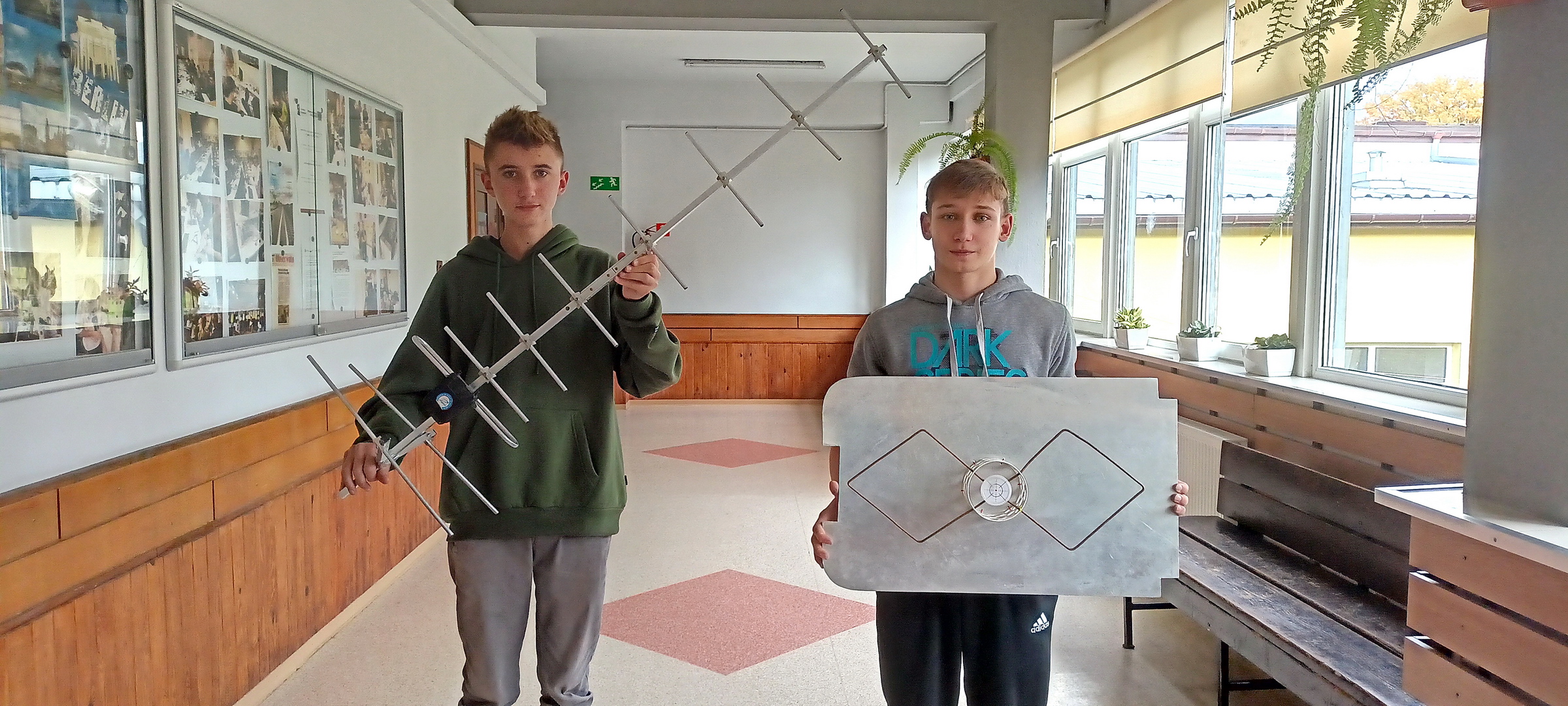 Lider projektu Filip Szymaszek oraz Ignacy Wójcik (kl. 1dT) z antenami służącymi do odbioru danych z opadającej na spadochronie sondy.