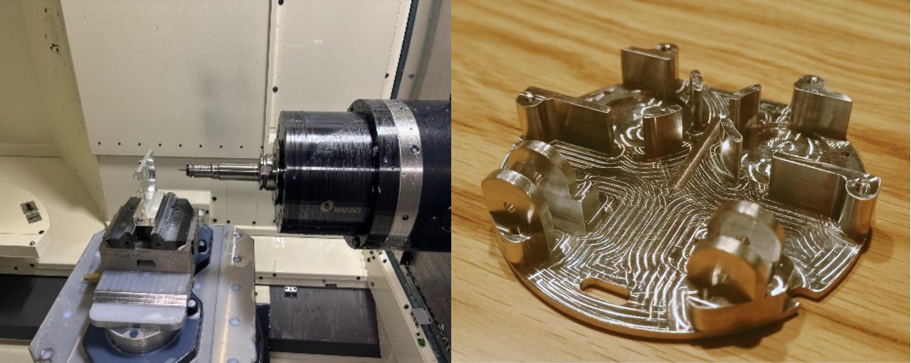 Frezowanie detalu z aluminium w firmie Ultratech. Po prawej stronie – gotowa płytka.