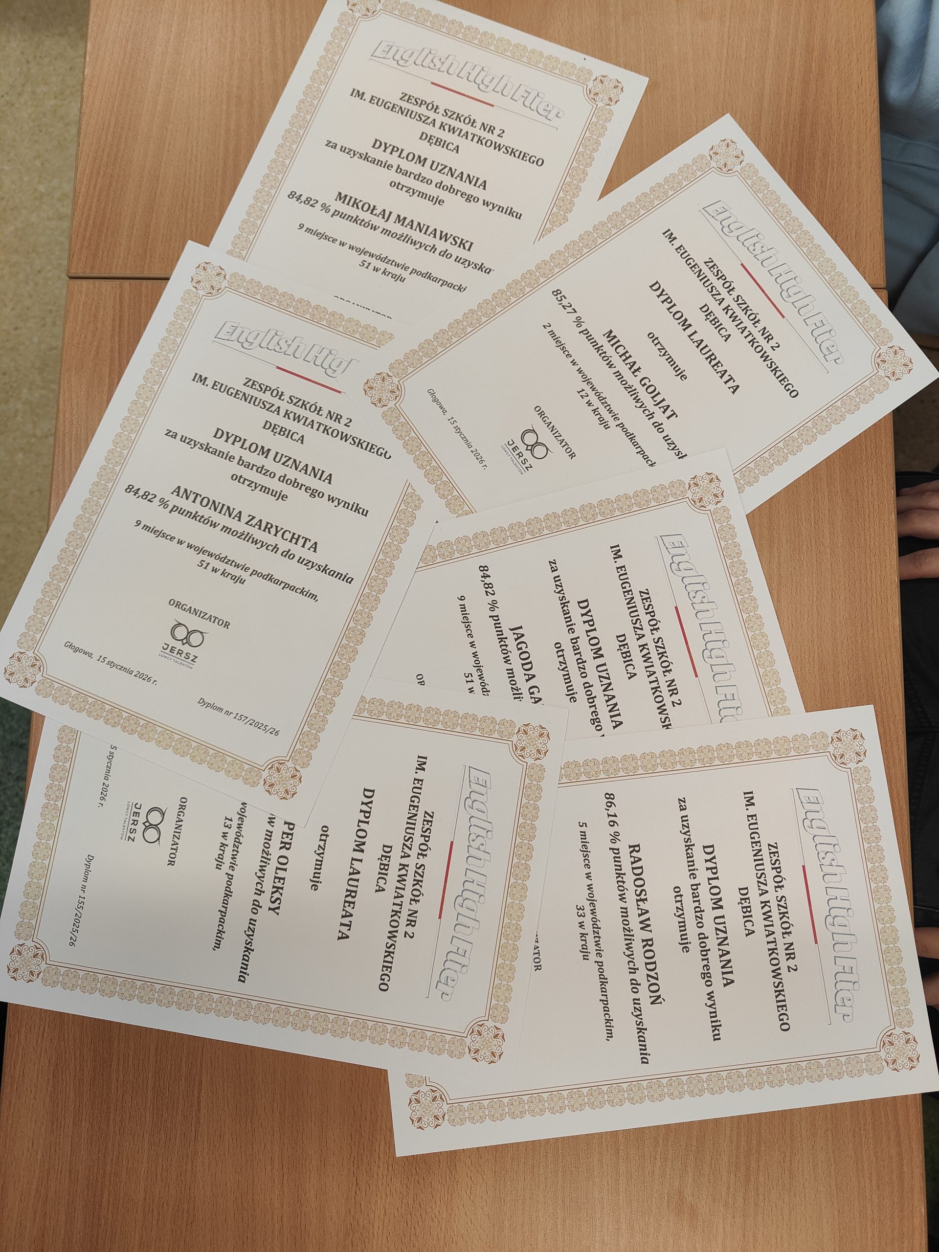 Konkurs języka angielskiego English High Flier edycja 2025 zorganizowany przez ogólnopolskiego organizatora konkursów ŁOWCY TALENTÓW JERSZ. Jest to konkurs na skalę krajową, w którym wzięło udział 27 uczniów z klas LO i T naszej szkoły. Uczniowie byli podzieleni na 3 piony klas (klasy1, klasy 2 i klasy 3-5), w obrębie których rozpatrywane zostały wyniki konkursu.