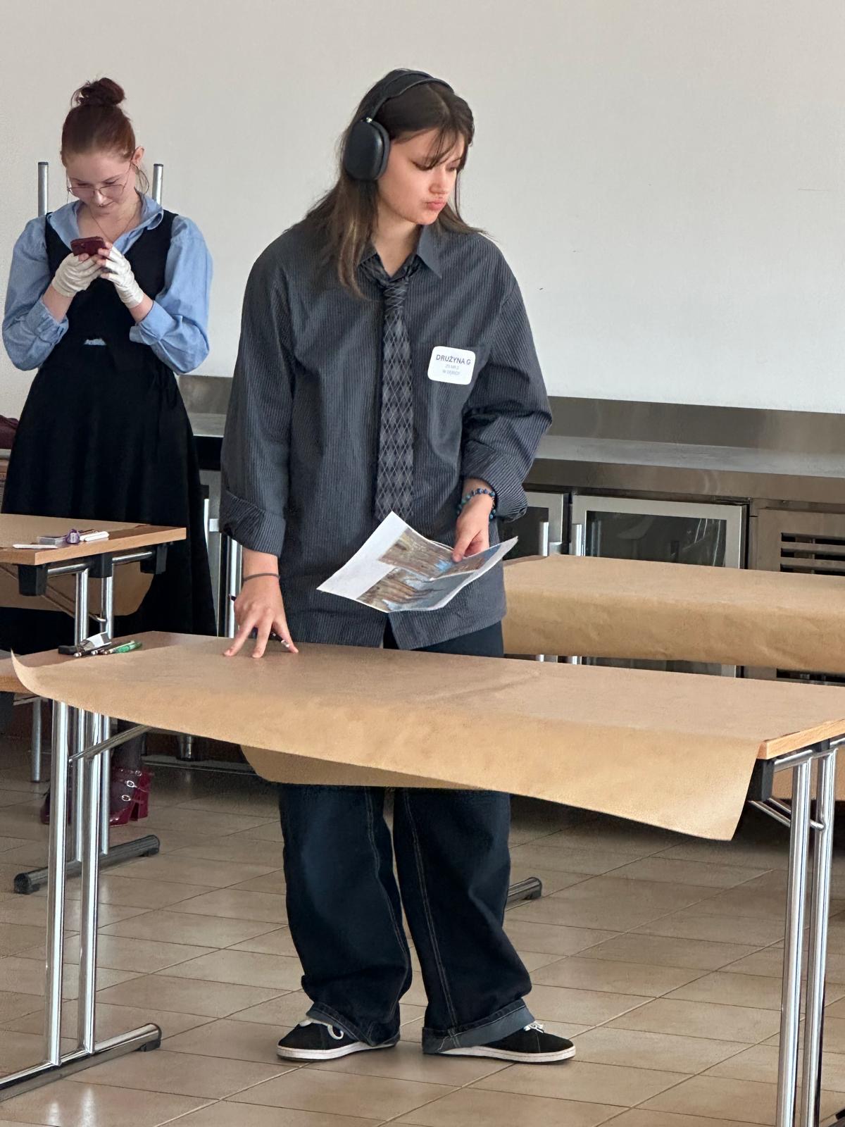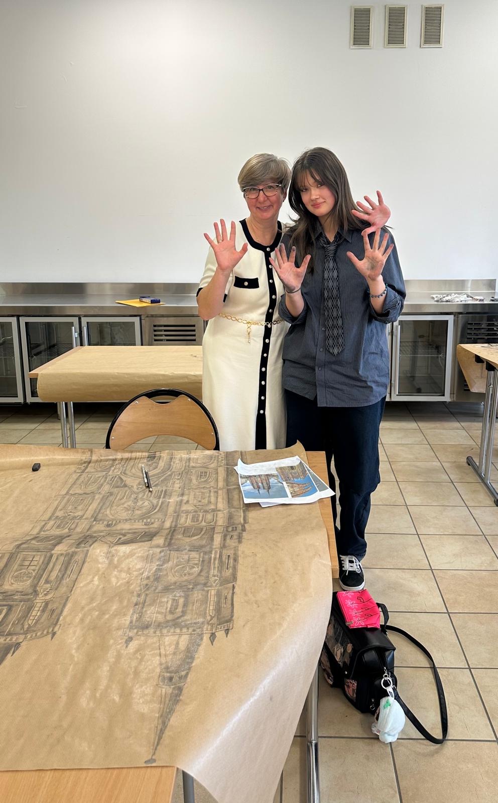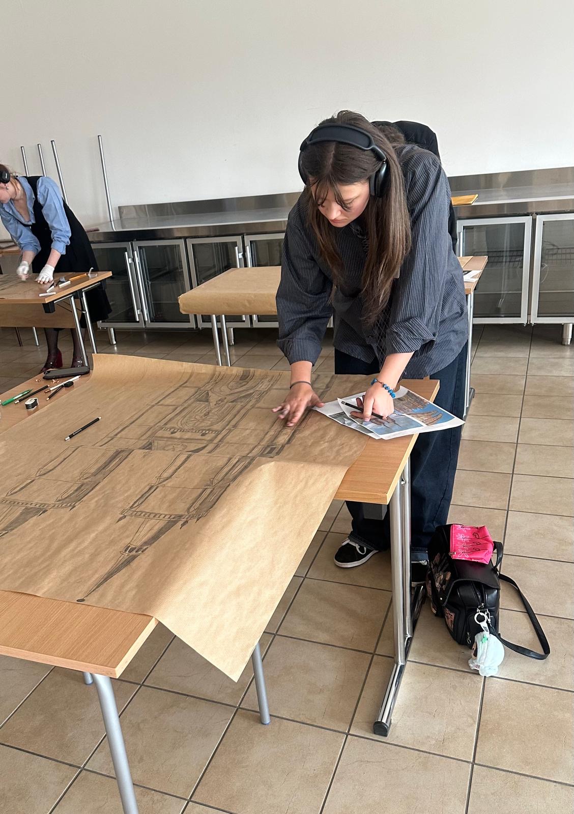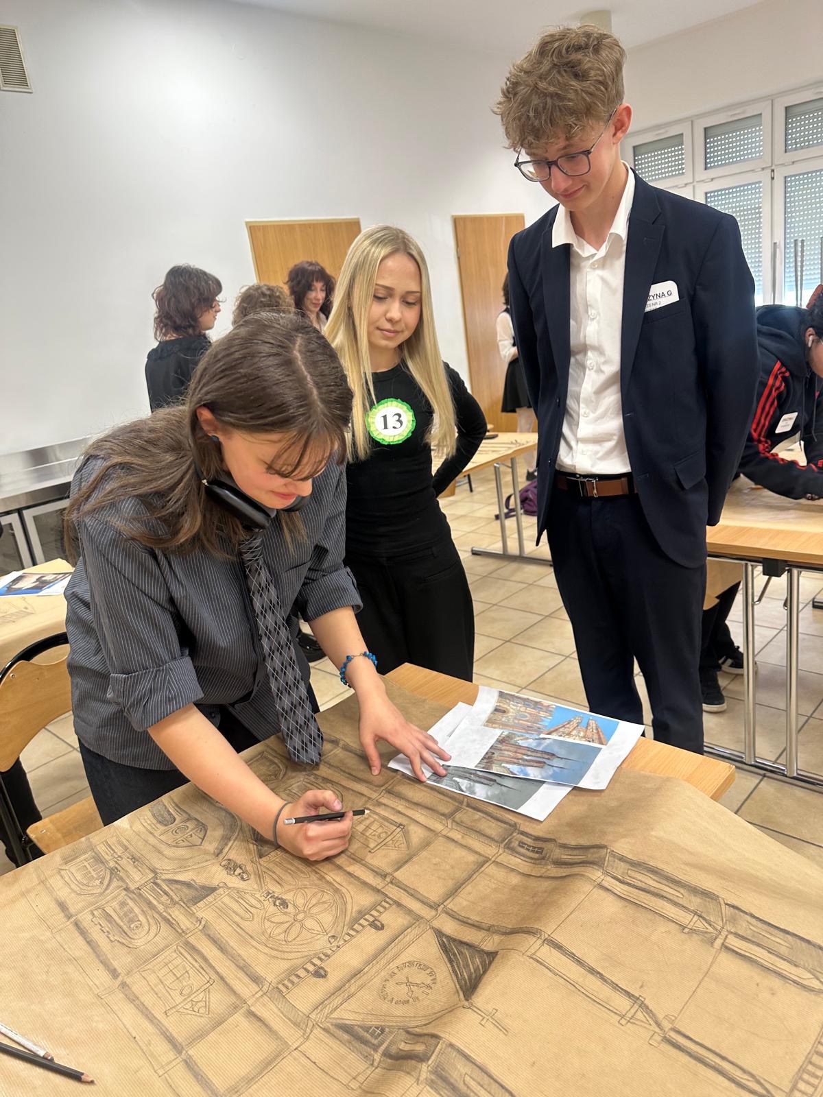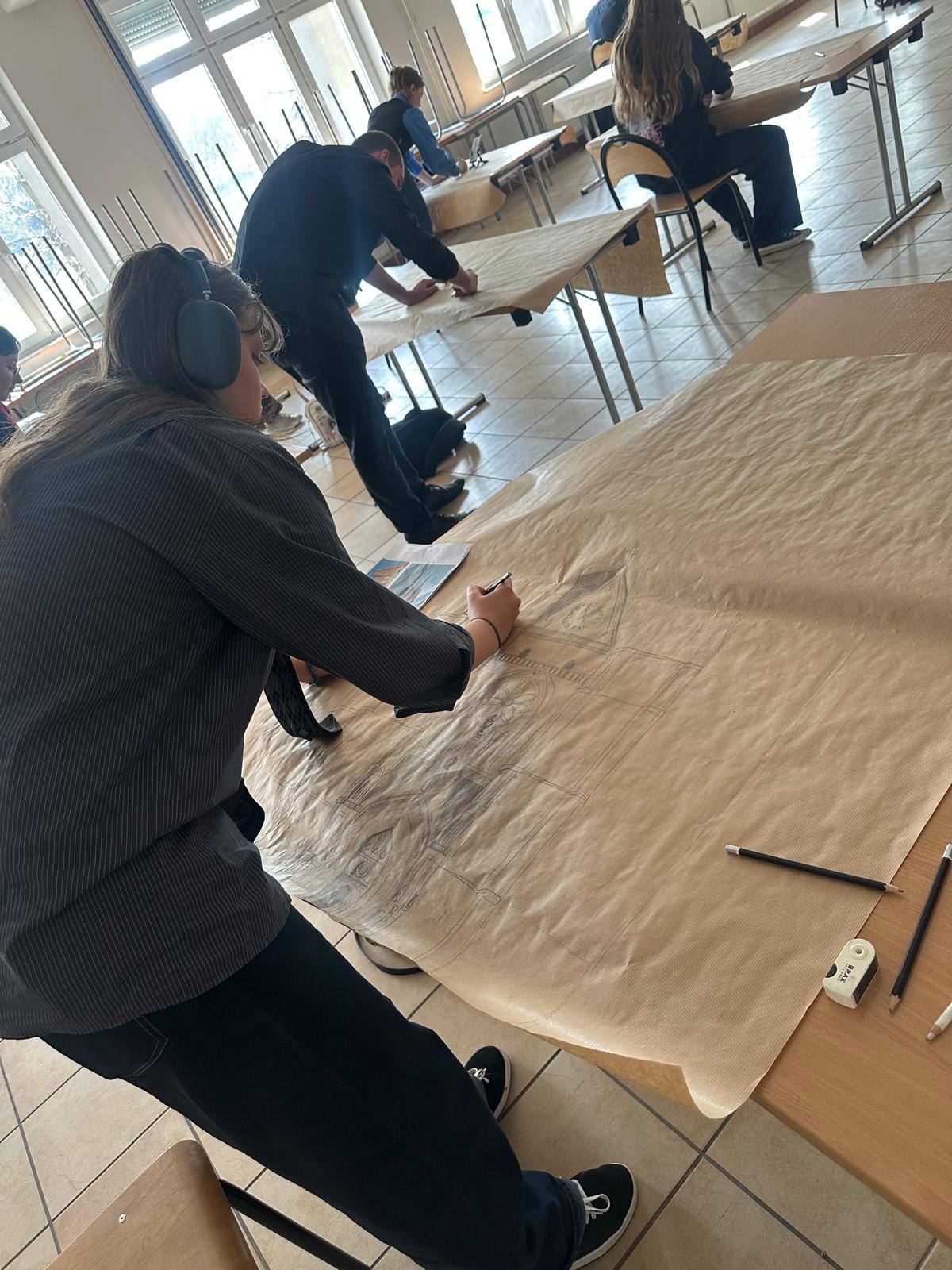 - oraz wykonanie szkicu budynku romańskiego lub gotyckiego na papierze dużego formatu. Naszą wspaniałą wykonawczynią była Jagoda.