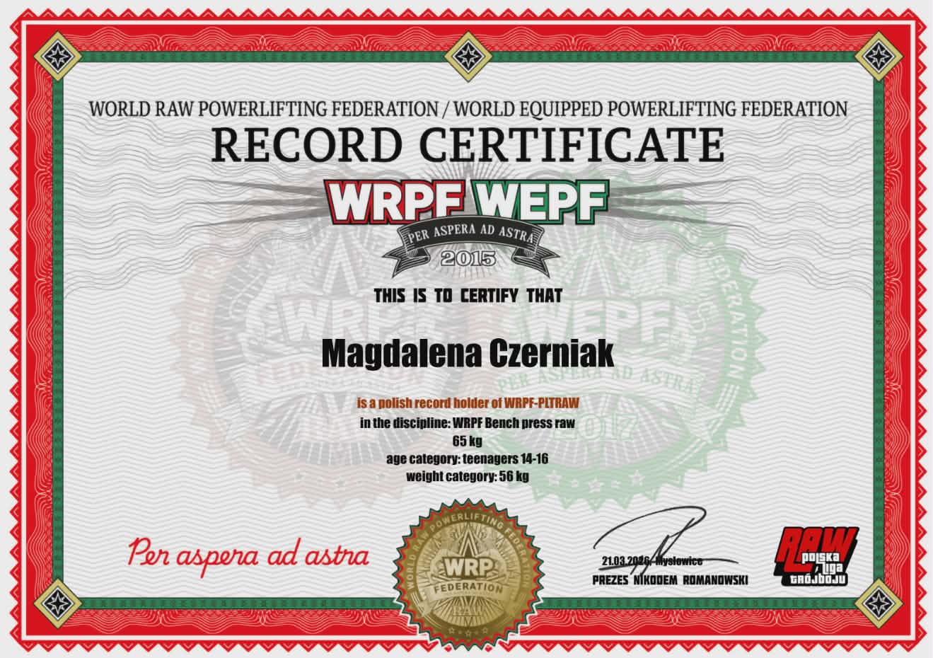 W konkurencji BENCH PRESS RAW ustanowiła nowy rekord Polski wszech federacji w kategorii dziewcząt do lat 16 w kat. 56kg.