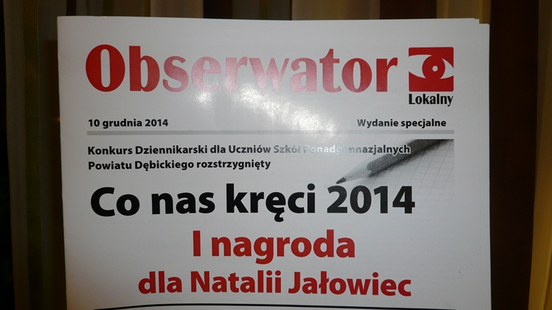 10 grudnia 2014 odbyło się uroczyste zakończenie V edycji Konkursu Dziennikarskiego dla Uczniów Szkół Ponadgimnazjalnych Powiatu Dębickiego organizowanego przez redakcję gazety Obserwatora Lokalnego. Ten mały jubileusz związany jest z dużym sukcesem naszej szkoły. Najwięcej prac nadesłali nasi uczniowie a jury wysoko oceniła ich poziom . Nagrodzono 10 osób, w tym 5 przypadło naszym uczniom.