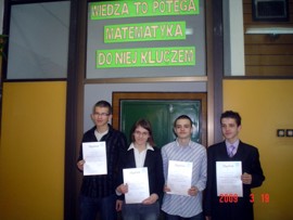 Dnia 6 marca b.r. odbył się w naszej szkole konkurs matematyczny dla gimnazjalistów. W konkursie wzięło udział 27 uczestników z sześciu szkół gimnazjalnych powiatu dębickiego. Uczestnicy mieli do rozwiązanie 4 zadania o zróżnicowanej tematyce i poziomie trudności. Komisja konkursowa składająca się z nauczycieli matematyki naszej szkoły postanowiła wyróżnić 4 osoby:
